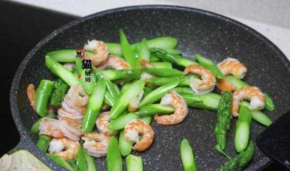 6.接着把汆烫过的芦笋倒入。两种食材都是易熟且汆烫过的,所以翻炒的速度要快,最后撒上少许盐提味盛出。