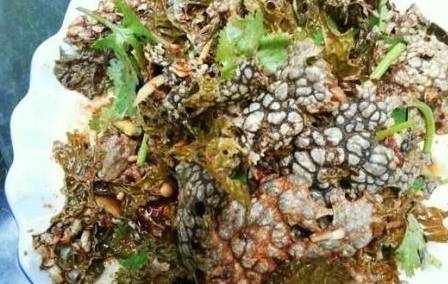 这个是树皮菜,云南这边的特色菜,最常见的吃法就是凉拌!树皮菜其实是一种苔藓类制备,长得很像青蛙皮,吃起来香香脆脆的!