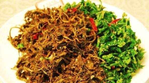 沙罗树尖。云南长大的朋友可能会吃过这道菜,沙罗树尖,就是沙罗树的嫩芽,摘下来后用水焯一下,凉拌着吃。