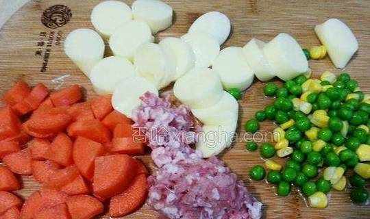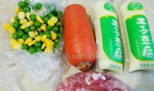 2.日本豆腐从中间切开取出切块,胡萝卜洗净切小块,肉末,玉米青豆洗净