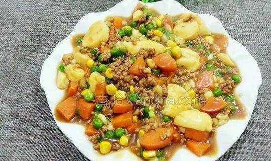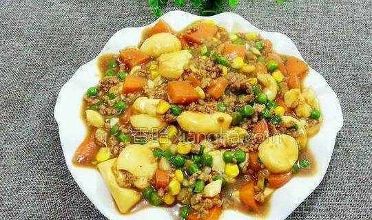 配料:日本豆腐2个、肉末少许、胡萝卜半根、玉米青豆少许、小葱少许、玉米淀粉少许、姜蒜少许、油少许、盐1小勺、料酒少许、耗油适量、六月鲜酱油少许烹饪步骤:1.准备好日本豆腐,玉米青豆,胡萝卜,肉末