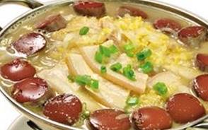 4、酸菜中放入十三香,盐,味精,姜片,将切好的梅肉放到最里面,五花肉外面一层,再炖15-20分钟,等到五花肉慢慢炖至晶莹剔透了,周围放入血肠,再炖5分钟,撒入葱花(喜欢吃香菜的可以撒点香菜),最好是连炉子带过一起上桌,一边炖一边吃,那感觉老好了!