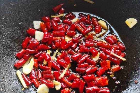 8.将炸鸡块的油倒出,留一些底油,下入花椒和干辣椒圈小火炸制,将干辣椒圈炸出辣香味。再下入姜丝和蒜片炒香。