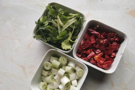 4.把葱切小段,姜切末,大蒜切片,香菜切段,干辣椒用剪刀,剪成辣椒圈。