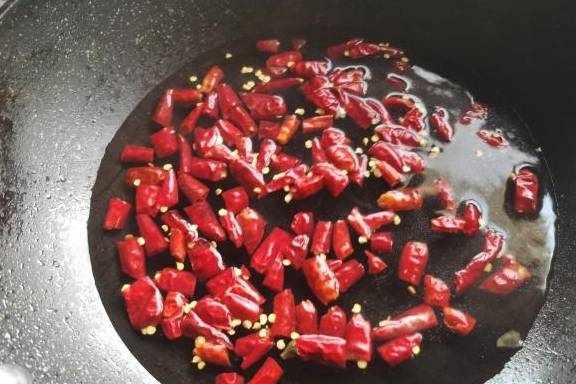 5.锅加水烧开,把干辣椒圈下入开水中烫一下,捞出,沥净水分,干辣椒段比较干,炸制时容易焦,干辣椒炒焦了有苦味,卖相也不好看,多加了焯水这一步,这样炸出的干辣椒段就不容易焦糊,味道香。这是炸辣椒香酥、不焦的小技巧。