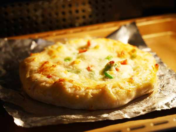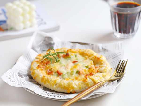 7.饼干底烤的脆脆的,上面的芝士都被撕碎了,快手好好吃,一口吃完好满足!