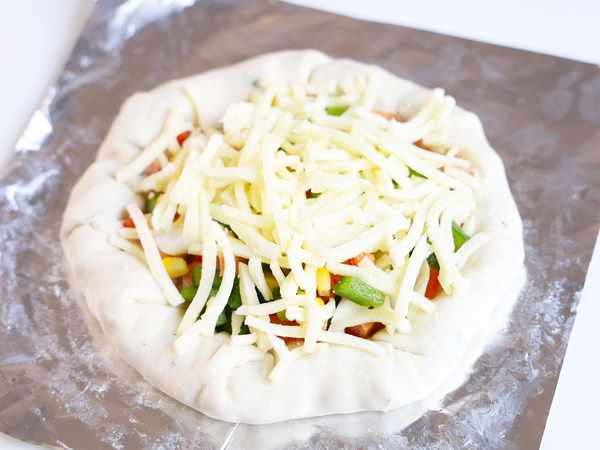5.放入圣女果丁、青椒丁、火腿丁、玉米粒,撒上一些磨碎的芝士