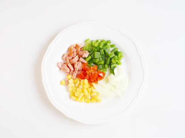 1.准备圣女果丁、青椒丁、火腿丁、玉米粒