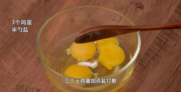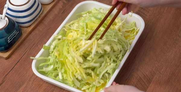 准备白菜1个,洗净切丝,鸡蛋三个打散,加半茶匙盐。