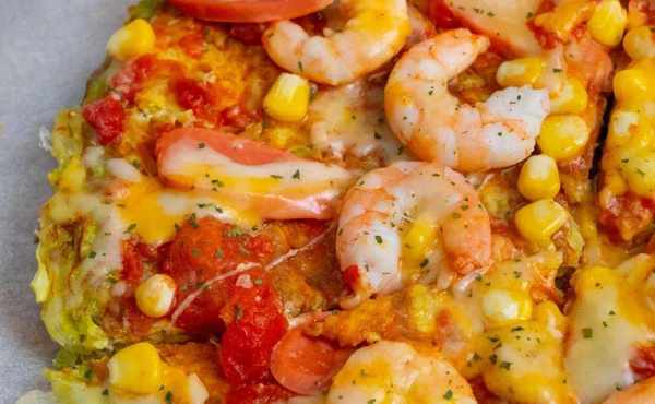 翻面加入2汤匙番茄酱、火腿肠、虾仁、玉米粒、马苏里拉芝士。