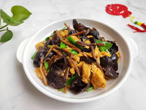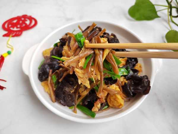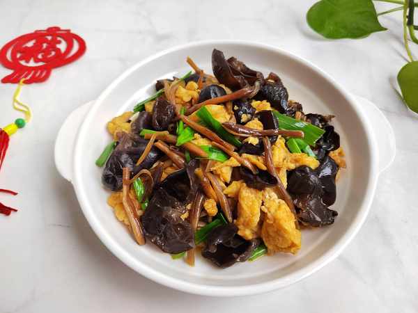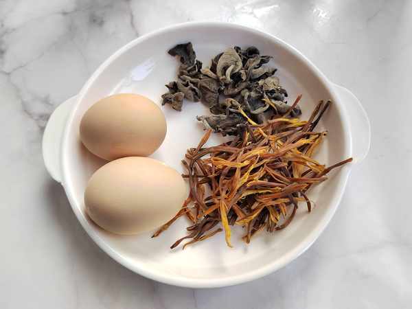 主要原料:黄花菜15克;木耳10克;两个鸡蛋。