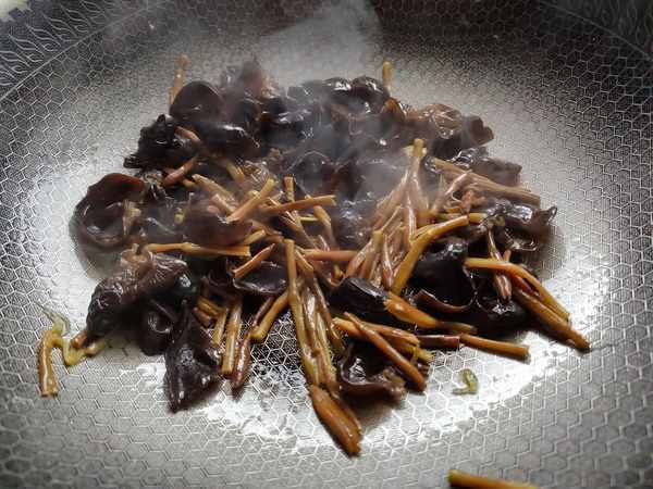 第六步:锅内留底油,放入黄花菜和木耳翻炒片刻。