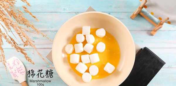 加热平底锅,用小火融化30克黄油,加入100克棉花糖,搅拌至融化。