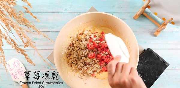 继续小火加热,加入40g奶粉搅拌至浓稠,加入80g杏仁片和20g冻干草莓拌匀。