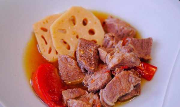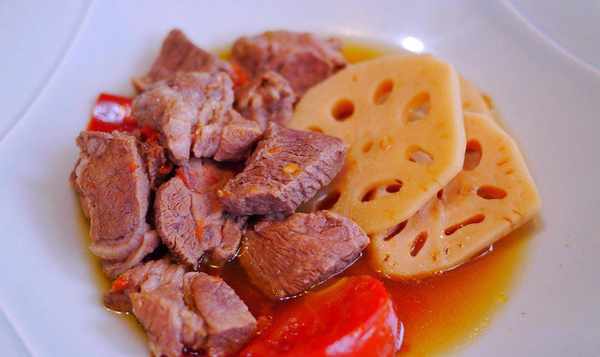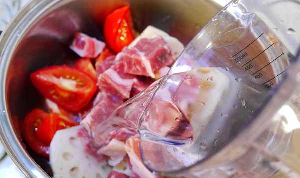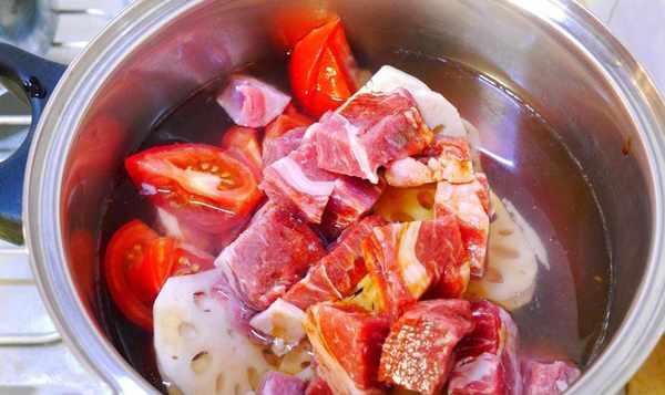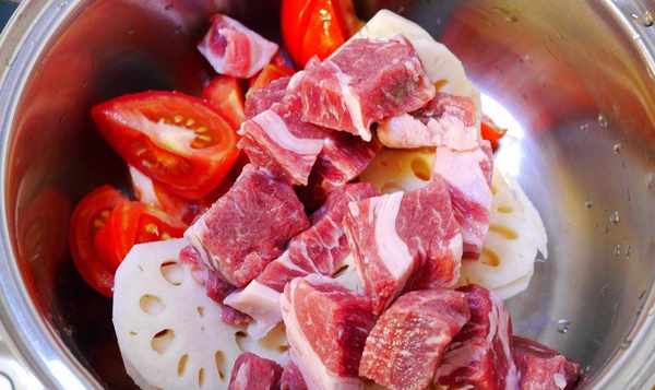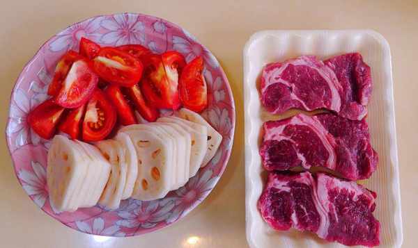 <西红柿蒸牛肉>材料:梅花牛肉300g(超市买的),莲藕300g(一大份),西红柿200g(两个),700cc。过滤水,50c.c.酱油