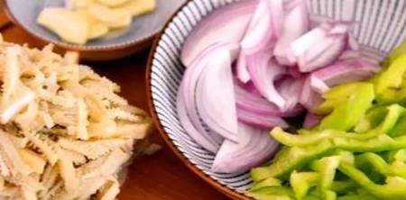 牛肚洗净、青椒、洋葱切丝备用。