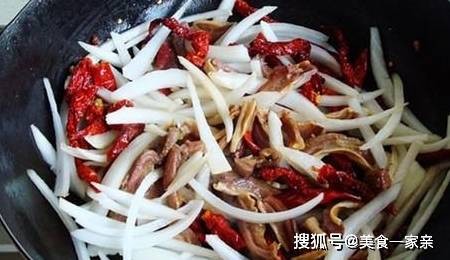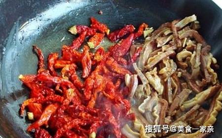 把牛肠子拨在一边,辣皮子凉水泡软切段,放入翻炒出香。