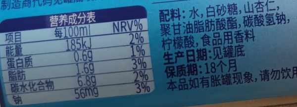 这样推算一下,包装为240ml的杏仁露中,蛋白质为1.44克。脂肪为3.84克。以此来返算杏仁的加入量,按蛋白质口径为6.26克,按脂肪口径为6.4克。
