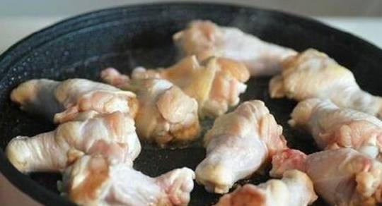 2、鸡腿洗净,热锅热油,煎至金黄,捞起;