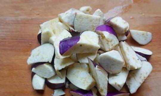 首先把食材都准备好:茄子、青椒。茄子洗净切块,加入一些盐、淀粉腌制一下。