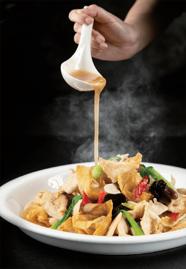 3. 锅内入剩余精炼油,待油温升至六成热时,下生抄手炸至色金黄后出锅,盛入大凹盘内(略带一点烫油),上桌时淋入制好的鸡片汤汁即成。