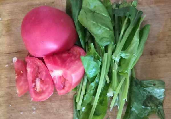 准备食材:西红柿1个、菠菜2根、挂面1把、食盐适量、香油少许。