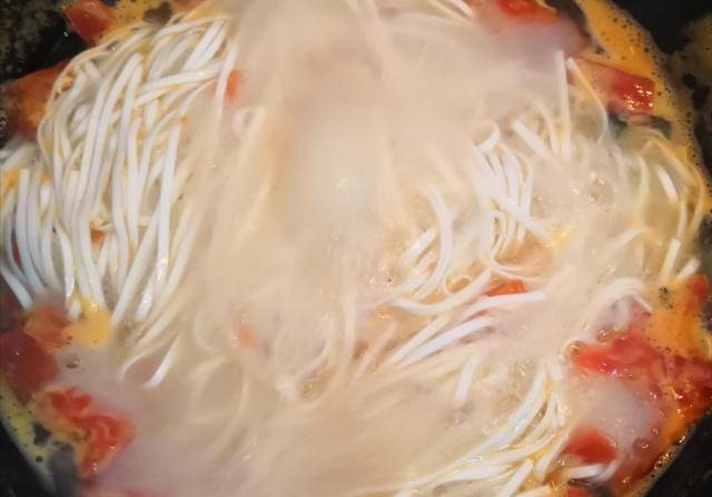 待西红柿煮烂后,锅中的水差不多再次煮沸了,放入1把挂面,用筷子不断地搅拌,防止其粘锅,影响口感。