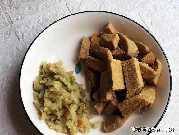 2:豆渣粑洗净后改刀切小块,酸菜切碎末。