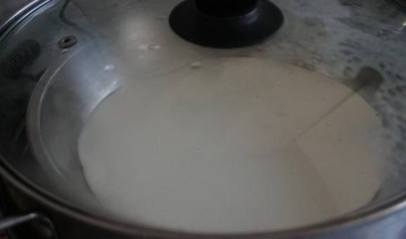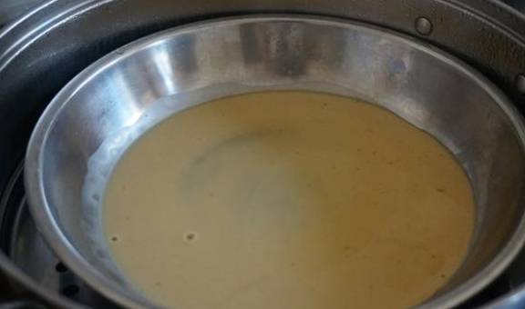 9.锅里的水烧开后,放上不锈钢碟子,先勺入一勺红糖粉浆,盖上锅盖,隔水蒸5分钟至凝结