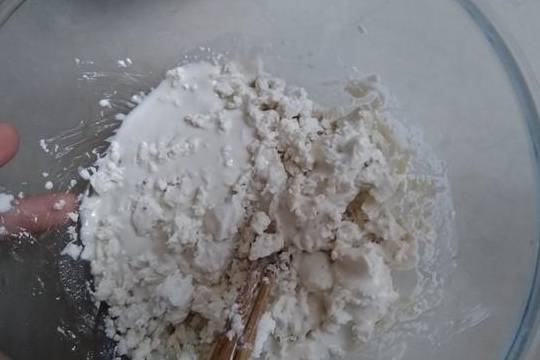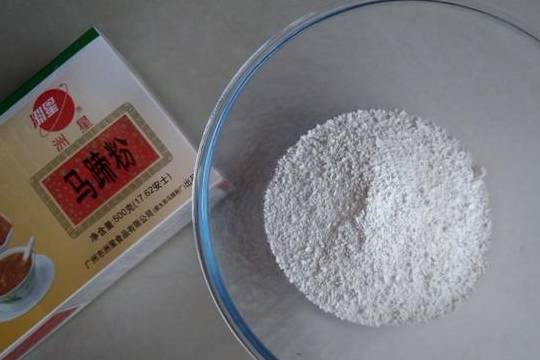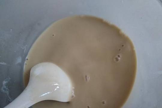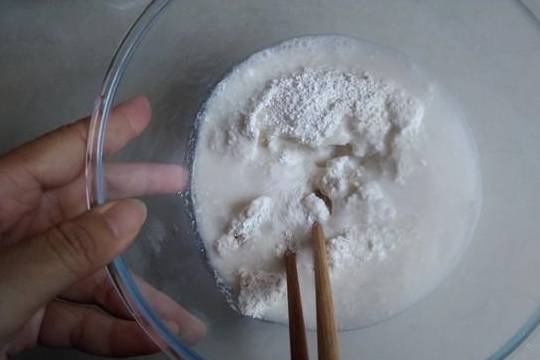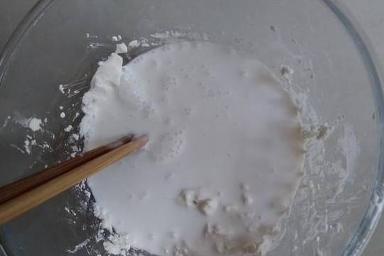 4.倒入水后,搅拌一下,让马蹄粉充分吸收水分。刚倒入水,如图中的状态,结块那样,别担心,待会儿再倒入液体的时候就不会那样了