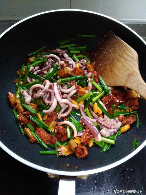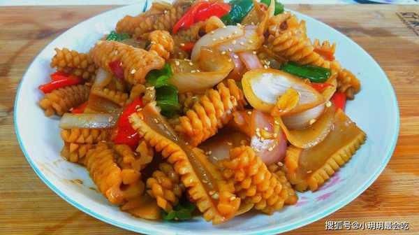 (2)鱿鱼片改花刀之后,不仅方便入味,同时减少了爆炒的时间,就不至于太老化了。