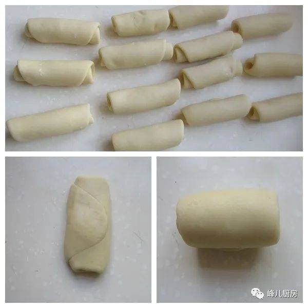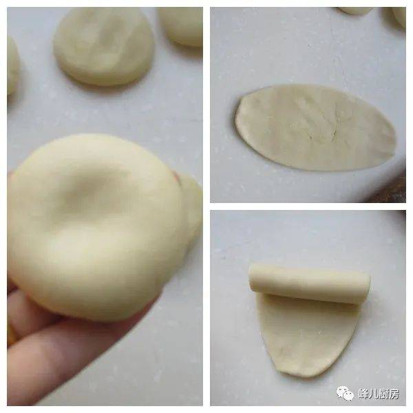 3、收紧口,按扁,擀成牛舌状,卷起来。
