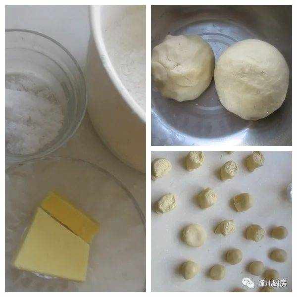 1、材料称重备用,把黄油融化加温水和匀倒入面粉和成团,玉米油加面粉和成团醒大约20分钟,分别揪成小剂子。