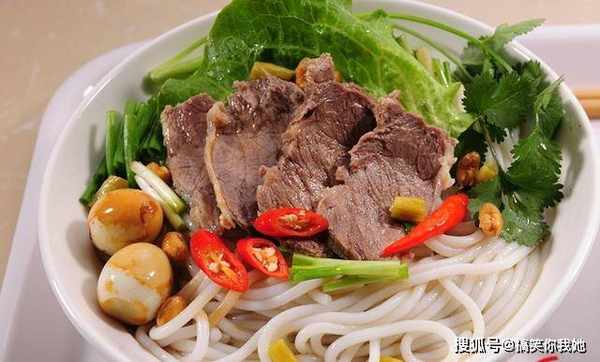 卤水有草果、香叶、丁香、沙姜、八角、甘草、胡椒、花椒、桂枝、槟榔、陈皮等,十几味香料,熬制而成,在卤水中烫熟米粉,再放辅料,例如牛肉片、香肠、配菜等,最后用