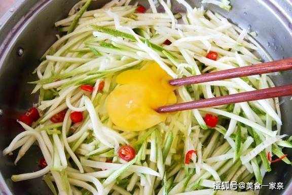 第二步:腌制好的白瓜倒出多余的水分,加入鸡蛋一个搅拌均匀,加入鸡蛋使其营养更加丰富。
