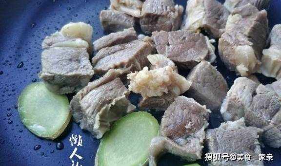 3、炒锅中加少许底油,加葱段姜片炒香后将牛肉下锅稍微煸炒下,经过煸炒后再炖的牛肉,肉味更浓,也会更有嚼劲。