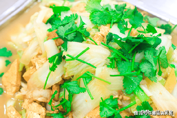 5分钟以后先放入白菜帮煨1分钟,再放入白菜叶一起翻炒,炒至白菜叶塌软放入适量的食盐、胡椒粉、鸡精、十三香再补一次味。