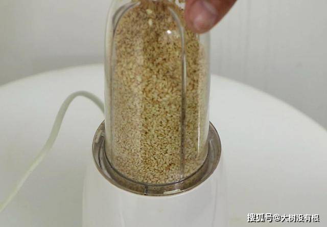 3.取一个家用的榨汁杯,把晾凉的芝麻倒进去,进行打磨就可以,不需要复杂的工艺,打磨期间,可以把榨汁杯多取下来几次摇晃一下,方便把芝麻充分打碎,打磨过程中,香味挡不住的往外溢。