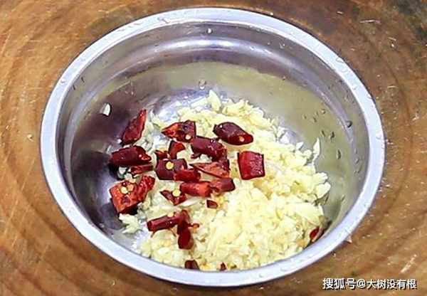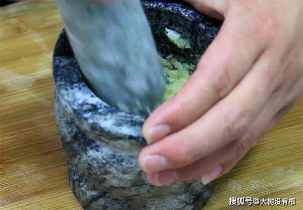 2.准备适量的大蒜,放在蒜臼里面捣成蒜泥;再准备小米椒五个,切成辣椒圈备用。