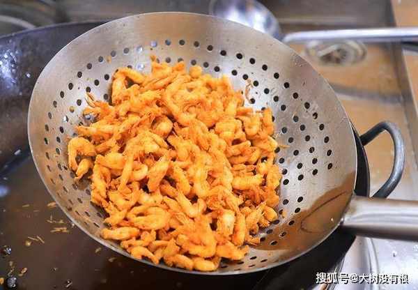 4.把锅中的残渣沥干净,升高油温至六成热转为小火,把河虾放入锅中复炸20秒钟立即捞出,这一步主要是把河虾炸酥、炸脆,逼出多余的油脂。