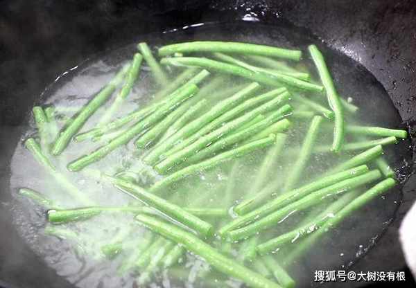 2.锅内烧水,加入少许植物油,植物油能保持豆角的翠绿,水烧开以后放入切好的豆角,焯水2分钟左右,豆角返青后倒出来,用清水冲洗冷却控水,豆角过凉水口感更脆,摆放在盘中备用。