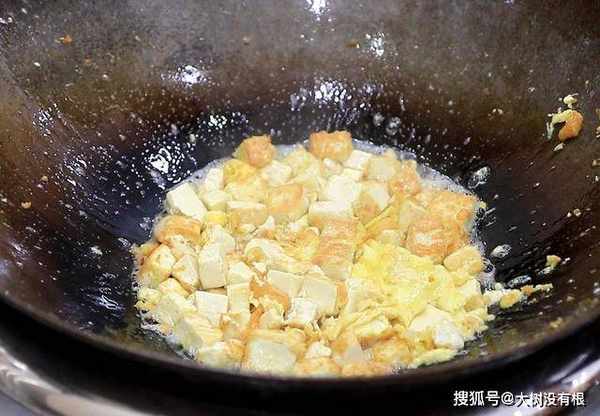 4.锅内烧油,充分滑锅以后倒出热油加入凉油,热锅凉油能防止煎豆腐时粘锅,把豆腐倒入锅中,有叠在一起的用勺子压一压,把它铺平这样受热更加均匀,保持小火慢煎,一面煎定型以后翻过来再煎另一面,不停地摇晃锅让豆腐均匀受热,大约煎制5分钟,豆腐煎成金黄色时倒出来备用。