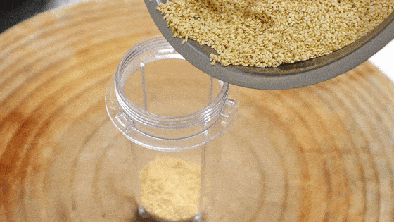 然后把晾凉的芝麻 放入榨汁杯中进行打磨,打磨过程中可以把榨汁杯取下来,摇晃几下,把芝麻充分打碎 打磨至看不到芝麻碎,呈细腻的糊状时 芝麻酱就做好了,轻轻摇晃均匀,倒入碗中即可食用~