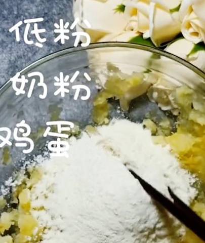 3.加入低粉,奶粉,鸡蛋,搅拌均匀。