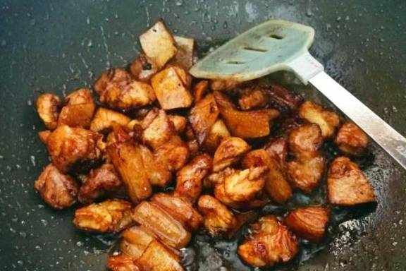 炒锅洗干净,擦干水,放适量的油,中火烧到六成热。调中小火,把肉块倒入炒锅里不断翻炒,炒至肉块表面变色(这一步时间久一点,烧出来的肉味道更好。)