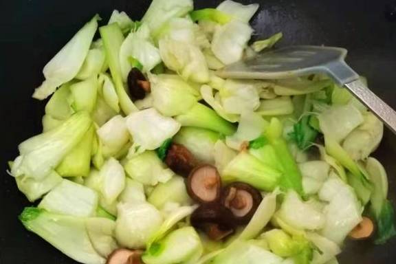 炒这道菜的时候,香菇先下锅炒,然后再下青菜梗炒,是能够炒熟的。