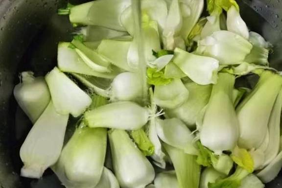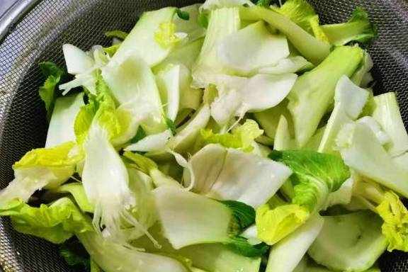 2、把青菜梗一片片掰开,然后用手一片片搓洗干净,再用加了盐的清水浸泡10分钟,最后用水冲洗干净,沥干水,待用。