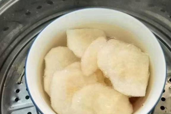 4、把雪梨片放在汤碗中,加适量的清水,开火炖至食材熟。