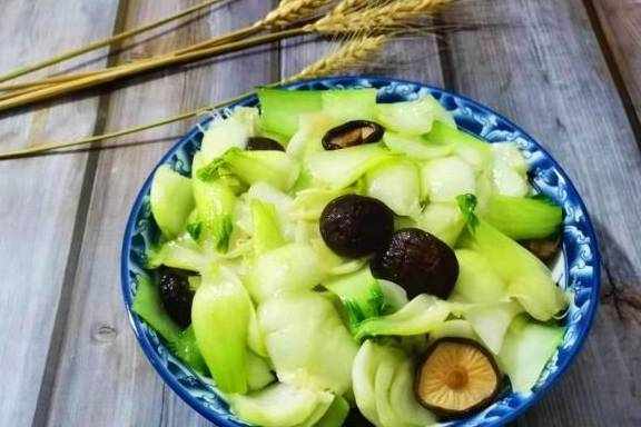 【主要食材】:青菜梗550克、干香菇10个、肥猪肉一小块(约15克)