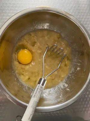 香蕉压成泥,打入一颗鸡蛋拌匀。